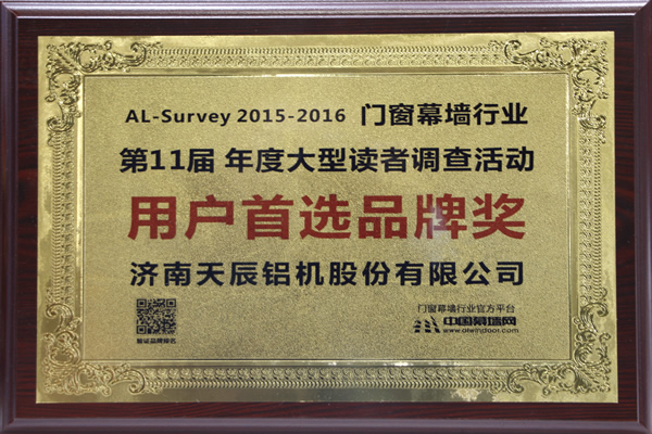 同期,由中國建筑金屬結構協會主辦,中國幕墻網承辦的“第十一屆AL-Survey2015-2016中國幕墻網年度大型讀者調查評選活動”頒獎儀式在在廣州廣交會威斯汀酒店隆重舉行,天辰股份榮獲“用戶首選品牌獎”。