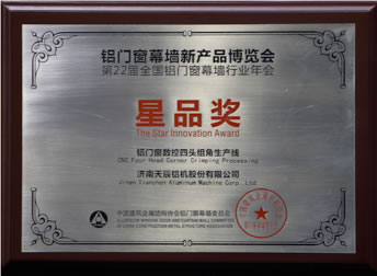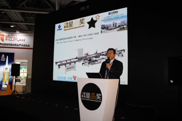 展會期間,在第二屆中國門窗幕墻年度星品評選中,天辰股份的數控四頭組角生產線以其填補國內空白的先進的技術及超高生產效率,獲得評審及專家的一致好評,勇奪“星品獎”。天辰股份市場部傅旺經理在星品發布會上對該設備進行了詳盡的技術闡述。