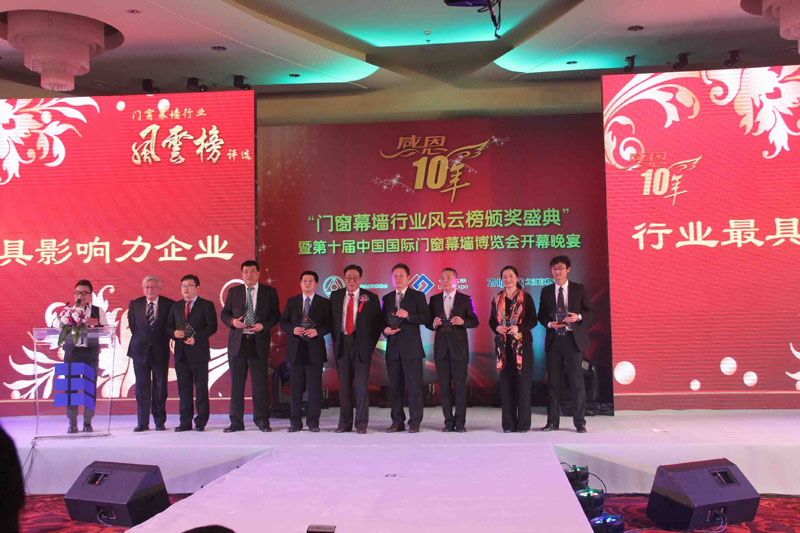 2012年11月23日,由中國建筑金屬結構協會主辦的“感恩十年——門窗幕墻行業風云榜評選”頒獎盛典在北京舉行。經過2個月的激烈角逐,我公司以絕對優勢高居加工設備類榜首,榮獲一呼百應大獎——最具影響力企業獎。 我公司自成立至今,始終把技術創