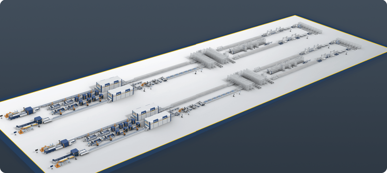 全球領先的超級門窗智能生產線,實現了從原材料上線到智能鋸切、激光鉆銑、智能分揀、自動齊套、四頭同步組裝、自動注膠、鉸鏈孔高效加工、智能RGVIAGV出入庫、凝膠緩存、門窗組裝調試、成品包裝等全過程的在線運行,并配備了填補行業空白的智能分揀倉,自動實現了窗體型材的分揀齊套,做到了全程不落地自動流轉和數字化精準管控。